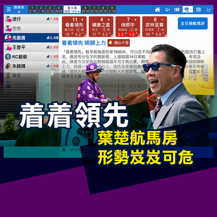 马季尚余4个赛日,叶楚航马房仍欠3场四班或以上头马才可达标,形势岌岌可危,看叶师傅在季尾的部署,一些工兵型的马匹会安排密密出赛,希望撞到好形势偷到一两场,像「闪电烈马」和「一铺纵横」,只要有直路1000米和田草1400米便会替其报名,另外有些马匹则操足来对准目标出击,例如之前减够分的「星云浩腾」和「龙腾飞翔」等等。